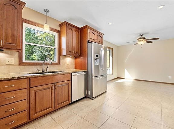 Rare find in Lenexa, cul-de-sac location on a beautiful nearly 1/2 acre lot! New master bathroom and custom designed kitchen featuring cherry cabinets, granite counters, soft close drawers, GE Profile appliances, gas cooktop, hood fan, advantium microwave, fridge stays! Granite sink with delta touch faucet, gorgeous China hutch w/ granite. Spacious family room with a multitude of windows that overlooks the large, fenced backyard! Large refurbished deck. Wonderful condition and ready to move in. First floor utility room, large family room addition. This home sits at the back of a 13 home cul-de-sac which is wonderful for family play in the island or within the cul-de-sac!