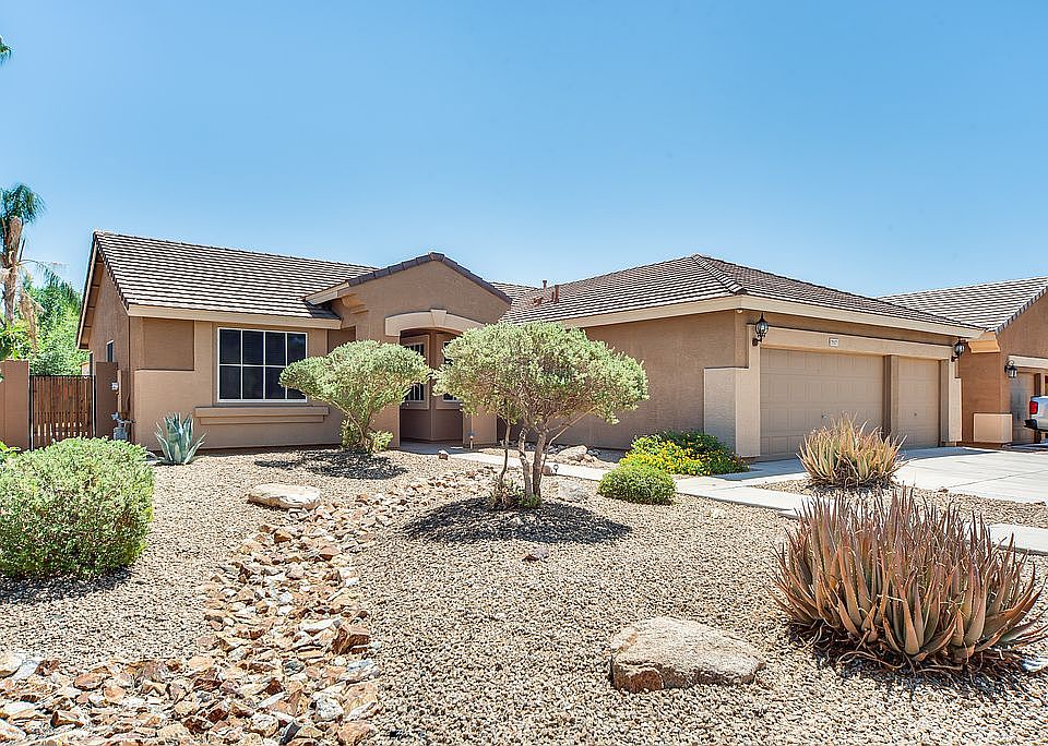 This east Mesa home is move in ready! With 1948 square feet, this single level home features a split floor plan which has 4 bedrooms, 2 baths and a 3 car garage. Extra large kitchen with stainless steel appliances, ample cabinet space and a spacious breakfast bar with room for seating and entertaining. The kitchen opens up to a large family room with a fireplace and vaulted ceilings! The master suite also has vaulted ceilings and is complete with a dual sink vanity, separate bathtub and shower. Step out of your family room and you'll see a large covered patio, and an extended pergola to keep the shade through the entire back of the home. The backyard is landscaped with lush grass, fruit trees and a shed for extra storage! This home is conveniently close to both I-60, loop 202, 101, and 2 blocks away from top rated schools! Come check it out today!