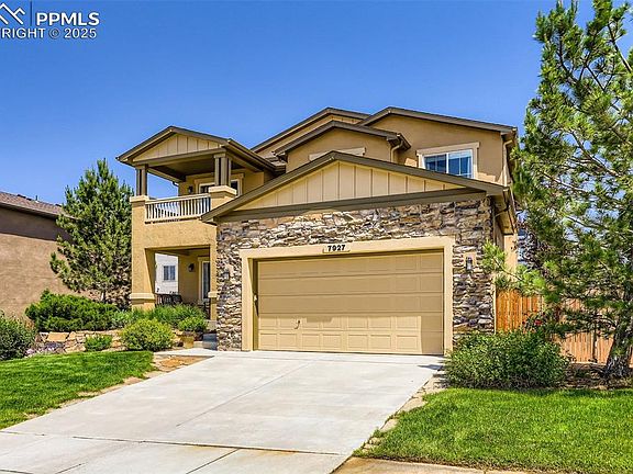 This beautifully designed two-story home in the desirable Cumbre Vista community offers comfort, style, and function. The open kitchen is a true showpiece, featuring stainless steel appliances, an oversized granite island, rich cabinetry, a tile backsplash, and both pendant and recessed lighting. The dining area flows effortlessly into the great room—perfect for gatherings. Just off the kitchen is a versatile bonus room, ideal for a playroom, office, or flex space. A stunning wall of windows in the great room fills the home with natural light. Newer carpeting and fresh exterior paint completed in 2023 add to its appeal. The home is topped with a durable Class 4 composite shingle roof. Upstairs, you'll find four bedrooms and a convenient upper-level laundry—no more hauling clothes up and down! The primary suite boasts breathtaking views of Pikes Peak and opens to a private covered "Juliet" balcony—perfect for enjoying Colorado sunsets. It also features a walk-in closet with built-ins, a soaking tub, and a spacious walk-in shower. The secondary bath is roomy and well-appointed, and an added A/C unit ensures comfort throughout the upper level. The finished basement, completed in 2019, includes a large rec room with built-in surround sound (speakers stay) and a spacious fifth bedroom with an attached bathroom, ideal as a guest or secondary suite. There's also ample storage for seasonal items. Off the 3-car tandem garage entry, a drop zone provides space for coats, shoes, and backpacks. The covered front porch is perfect for relaxing and visiting with friendly neighbors. Just across the street, enjoy a neighborhood park and open space. Located in the quiet and private Cumbre Vista subdivision, this home is part of award-winning District 20 schools and close to everything—USAFA, Peterson AFB, Schriever, Powers Corridor, Woodmen Road, and I-25. Enjoy easy access to Colorado’s great outdoors, shopping, dining, and more.