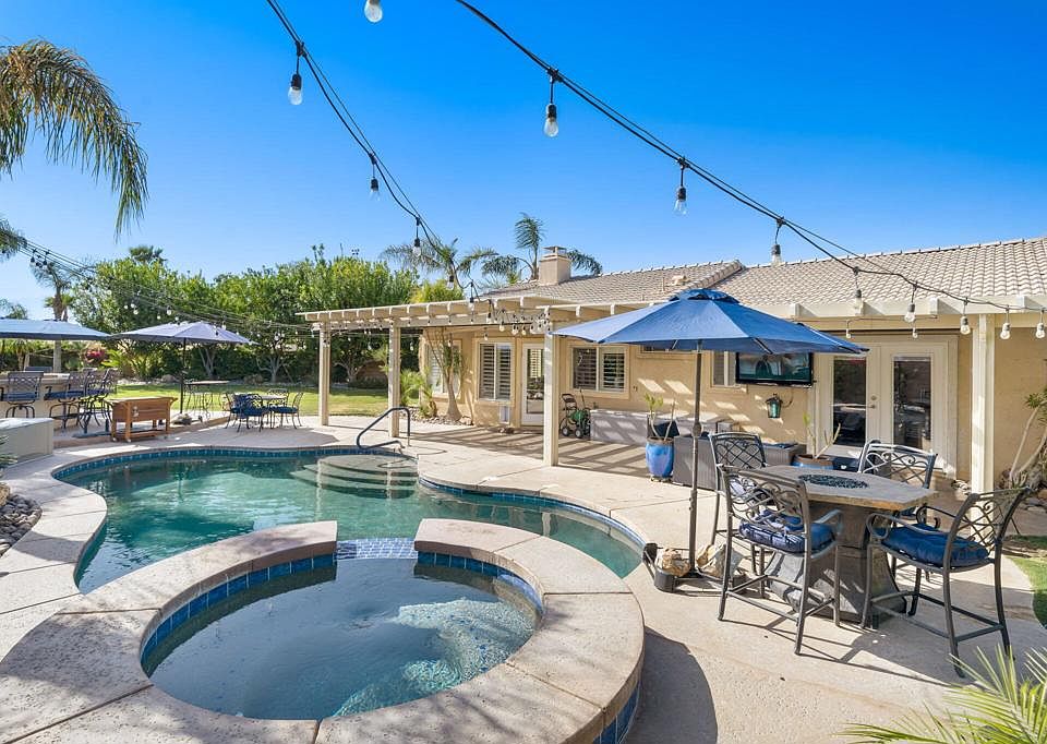 Desirably located behind the gates of Aliso in La Quinta, this beautifully remodeled single-level residence offers it all--a fresh interior, coveted setting and a massive resort-worthy homesite of approximately 12,632 square feet. Grounds impress upon arrival with a well-maintained front yard, mature trees and a covered entry porch. The wraparound yard continues to the south-facing backyard, where a park-like ambiance is amplified with a sprawling lawn, sublime privacy, a built-in BBQ bar, HDTVs, and motorized patio shades with a remote control. The pool and spa are showstoppers, complete with a new PebbleTec finish, a waterfall, and a new pump, filter and controller. Hosting three bedrooms, two baths and a versatile office in approximately 1,712 square feet, the interior is equally impressive, with a recent remodel removing walls to create a more open-concept environment that unites the entry, living and dining room in one continual space. An open kitchen is home to an island with seating, granite countertops with full backsplash, a walk-in pantry, mocha-finished cabinetry, a French door to the backyard, a bay window and new stainless steel appliances. Vaulted ceilings, plantation shutters, tile flooring and fresh paint enhance the home, which includes a new washer/dryer set, a two-car garage and new ceiling fans. The primary suite opens to the backyard via dual French doors and showcases a remodeled bath, new closet doors and a large shower with frameless glass surrounds.