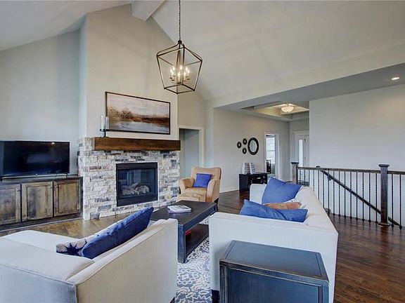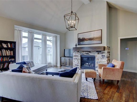 Ring in the new year in this wonderful expanded reverse one and a half story. Enjoy the scenic views of the beautiful, unobstructed Kansas sunsets. Main floor master suite and second bedroom, main level laundry. Vaulted great room with stone fireplace, hardwood floors. Spacious kitchen with oversized island, granite counters, breakfast area and formal dining area. Enjoy the outdoors on the deck or fire up the outdoor stone fire pit. Finished daylight lower level has two large bedrooms, each has its