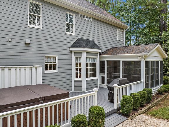 15k price improvement! Sitting on a wooded 1 acre lot sits this 4 bedroom, 2.5 bath in desirable Wake Forest. Recent updates include new roof, new gutters with gutter guards, new upstairs HVAC, updated exterior fixtures and EZE Breeze windows in the enclosed porch. The first floor offers real hardwoods throughout, dedicated office, formal dining room, breakfast room with a great view of the yard and a cozy living room with access to the porch which can be enjoyed year around. The primary has dual vanities, soaking tub, walk in shower and a walk in closet. Every bedroom has a walk in closet! Fourth bedroom could easily be used as a bonus, exercise room, etc. Walk up attic offers plenty of storage or room for future expansion. The hot tub conveys and is perfect for enjoying the cooler fall weather!