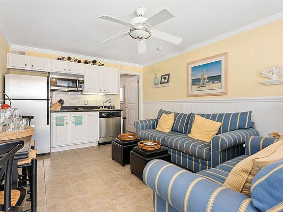 This oversized 1 bedroom unit at Oceanview Condominiums offers one of the best condo experiences on the island with an amenity filled, beach block lifestyle just steps from the sand and surrounded by ample dining and entertainment options. The heated pool is outstanding for a quick dip or a day off the sand. Need a workout on vacation? No worries because you have a gym on site! A large grilling station, private storage locker, assigned parking spot, and laundry room are all added amenities for this complex. This beautifully updated unit is located on the 2nd floor with a highly desired floor plan featuring a larger than normal full bath and closet space off the bedroom allowing for an open concept living/kitchen area. The full service kitchen has upgraded cabinetry and granite counters and subway marble tile back splash. Tile throughout the unit makes for easy cleanup after days on the beach! Enjoy lounging in front of your unit or take advantage of the sundeck also conveniently located on the 2nd level. Recent upgrades include a new water heater and AC unit 2019, custom plantation blinds, and grandfathered front door screen. This is the escape you have wanted with everything you need to sit back, relax, and soak up the ocean breeze. Enjoy holidays at the shore because this is a year round complex and pet friendly!! Schedule a showing now and see why this property makes for the perfect getaway.