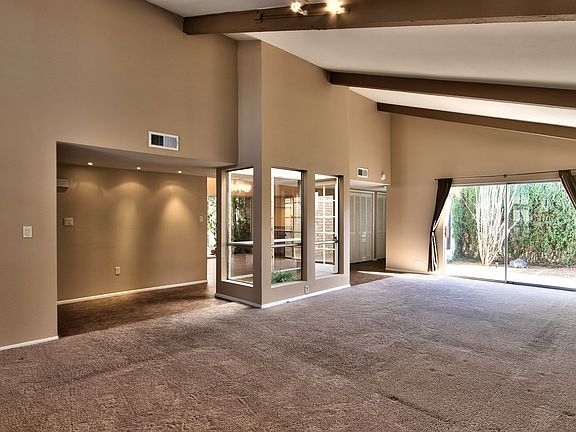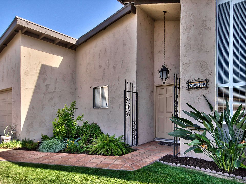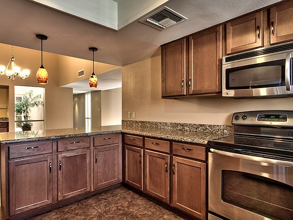 Granite countertops in kitchen and bathrooms, tile in all the right places, carpet in living room and bedrooms. Gorgeous stainless steel appliances, newer light fixtures, contemporary ceiling fans in bedrooms, double master bath sinks with large walk-in closet. New garage flooring in 2-car garage and open layout throughout the house, perfect for entertaining. Living room, dining room and master bedroom face out to private internal patios with new sliding glass doors. Garden-sanctuary off of main dining and master bedroom. Skylights in the atriums allows for natural lighting flowing throughout the house. Flagstone through the patios, orange tree in the backyard, and mature landscaping. New epoxy flooring in garage.