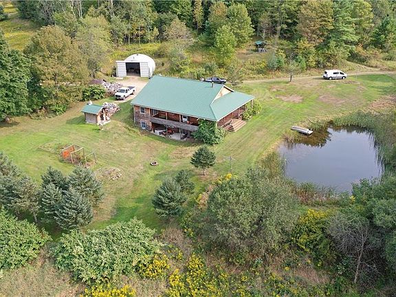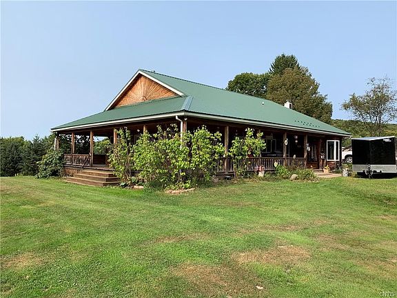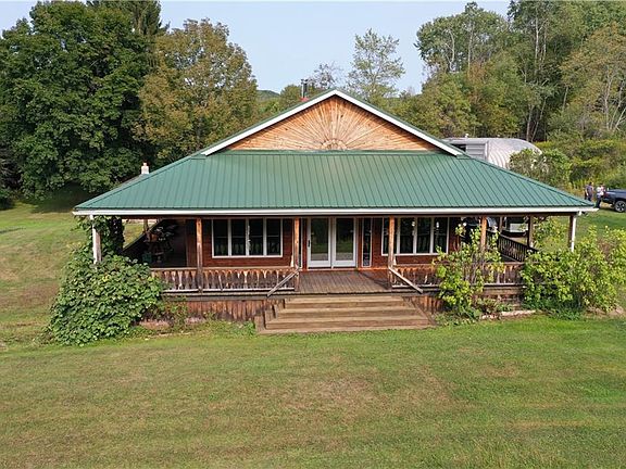 This property has it all! Located on the Cattaraugus/Allegany County line this beautiful custom built 2-bedroom 2.5 bath home on 107 acres in a quiet secluded area well off the main road. First floor has full bathroom upon entry with washer and dryer hookup. Master Bed and Bath with his and her large walk in closet area for plenty of room and built in bookshelf. Master Bath has large walk-in shower with double sink and soaking tub. Second large bedroom has large closet as well. Farther down the hall leads into large open concept kitchen, living room and dining room with cathedral ceiling. Large windows throughout letting in plenty of natural light. Kitchen has custom cherry cabinets with large triple sink and an island. Downstairs is finished basement with walk out sliding glass door and plenty of windows for natural light. There is a double office, large open area perfect for a second living room and half bathroom. Plenty of space to build on another bedroom or recreational room. Both basement floor and 1st level floor has radiant heat built into the floor. The entire home has custom one of a kind wood cabinet, trim, Tongue and Groove and wainscoting throughout.