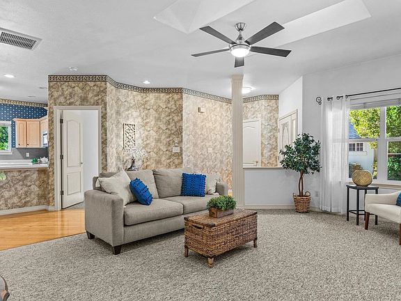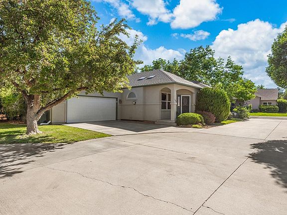 Come tour this charming one-level stucco rancher in the peaceful and private Alpine Village Estates, just north of town off H Road. Nestled on a cul-de-sac, this home boasts mature landscaping. Common areas, lawn and shrubs are maintained by HOA. Enjoy the beauty without all the upkeep! The main bedroom features an ensuite bathroom, a walk-in closet, and access to a serene patio covered by a lovely tree canopy, perfect for relaxation. The east-facing patio welcomes the morning sun and offers cool, shaded evenings, ideal for BBQs, outdoor seating, and even gardening. The open concept living area with high vaulted ceilings creates a spacious, light, and bright environment, seamlessly connecting the dining, living, and kitchen areas. Cozy up by the large gas log fireplace with custom shelving and built-in alcoves. The roomy kitchen offers ample cabinetry, counters, and a sizable pantry. This home includes two split bedroom suites for added privacy. The large, finished two-car attached garage and a newer central air system ensure lasting comfort. Brand new carpet throughout and a well-designed laundry room with extra storage, washer, dryer, and utility sink add to the convenience. Low maintenance and perfect for lock-and-leave living, this home is ready for a new owner. Don't miss out!