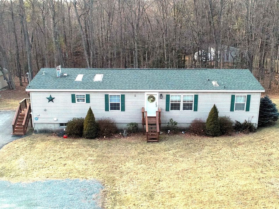 OPEN HOUSE Saturday 11th from 11-1pm. This hard to find charming well-kept 1680 Sq/ft manufactured home placed on a full poured concrete walk-out basement. This 3 bedroom home features a large functional kitchen with gas range, dishwasher, center island, skylight and plenty of storage and countertop space. Adjacent to the kitchen is the mudroom entry/ laundry area making for convenient laundry as well as a place for your coats and boots. The nice sized dining area separates the kitchen from the living room and has space for a large table. The carpeted living room is enormous (18 x 27 ft!) with 2 distinct seating areas, a pellet stove, and walks out onto the large deck overlooking the rear fenced yard. The large private primary bedroom suite features dual closets and en-suite 3/4 bath with 2 sinks and a skylight. At the end of the home is the 2nd and 3rd bedroom and a shared full bathroom. The 2nd bedroom has a good sized walk in closet. The 3rd bedroom is smaller and would make a great office if you didnt need the extra bedroom. An interior stairway walks down to the full dry poured concrete basement. This large basement walks out to the back yard and is at grade along the rear of the home. It offers many options for being finished into a family room etc. Located in a quiet rural area close to Brattleboro and Keene, this home is set back nicely on the 1.47 acre lot, has a 2 car garage with power doors. A shed and firepit are at the rear and visited often by the local deer.