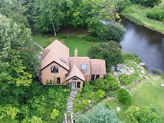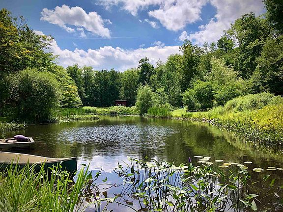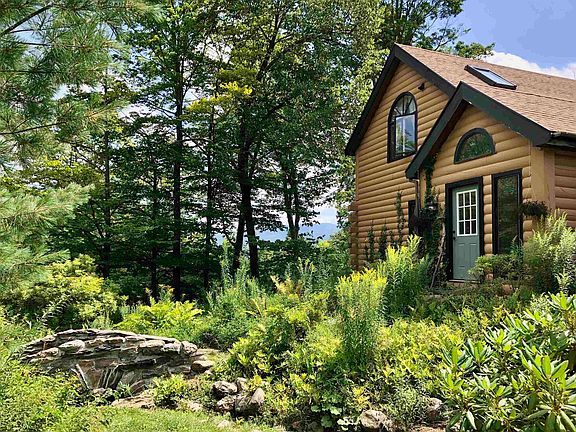 James Hilton's definition of Shangri-La was "a remote idyllic hide away." We now offer such a place. Nestled in the hills of Pawlet on +/-64 surveyed acres is this serene paradise abounding with wildlife and natural beauty. You enter on a beautiful winding drive coursing through hardwoods and are immediately drawn by the splendor of this unique and special compound with a large spring fed pond, streams and a waterfall with bridges and walkways, gardens and views. The main log home, 2 bedroom guesthouse, and small bunkhouse are situated to take full advantage of the distant, inspiring views over the Mettawee Valley. The main home has a kitchen with island, bay window (views), cathedral ceiling breakfast nook, a cathedral ceiling living room with wood stove, cathedral ceiling sunroom with marble floor and circular marble terrace overlooking pond, a bedroom and full bath down. Upstairs there is the primary bedroom and bath with cathedral ceiling and sliders to a balcony to take in the views. There is also a 2 story guest house with a large open room with wide plank floors with a wood stove and 1/2 bath on the first level and 2 bedrooms, a full bath and a large cathedral ceiling eat-in kitchen with deck overlooking the pond on the second level. Seldom do we offer a property that captures Vermont's natural beauty to the degree as does this artfully created retreat. The wildlife and total serenity of this magical world have to be seen to be believed!
