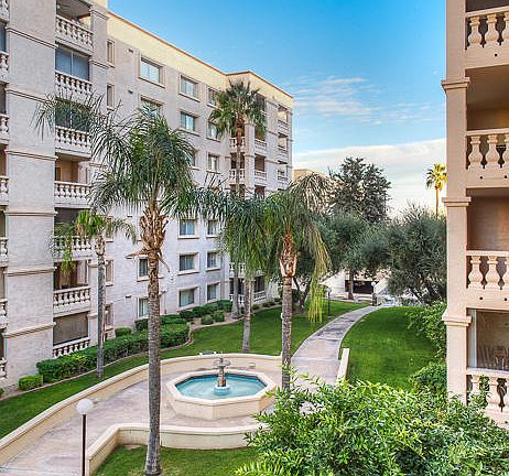 Remodeled. High rise living condo 2 BR, 2 BATH. Lease includes HOA fees, water, sewer, garbage, heating, cooling. Community offers golf, tennis, 3 heated pools, spas, saunas, gym, underground parking, guard gated, greenpath, all at your finger tips. Wonderful location, close to Old Town Scottsdale. Apartment features completely remodeled showers and vanities, timber ash wood floors. Walk into the kitchen to see all new stainless appliances with cabinets draped in white marble slab. Sorry no pets. Owner/Agent