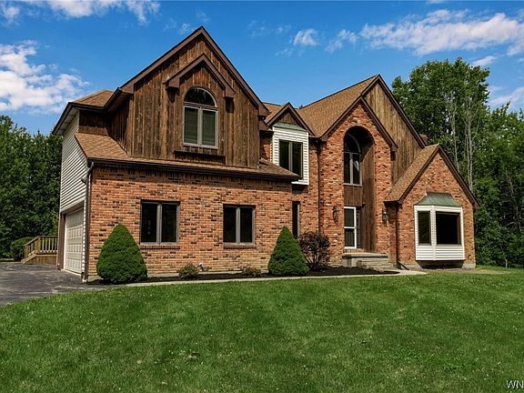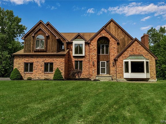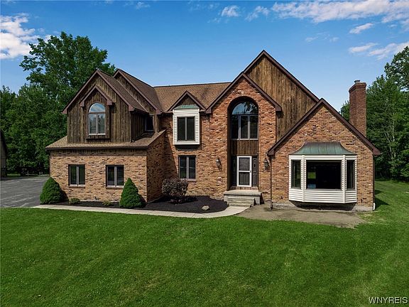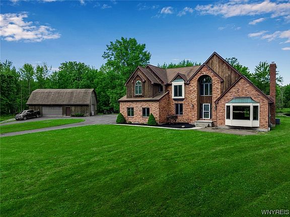 Enjoy the serenity of nature in this custom-built center entrance Colonial situated on an expansive 20 majestic acres, well-maintained park like setting located minutes from Clarence Center, shopping, parks, schools and Transit Rd. Enter the private driveway past the manicured lawn this home boasts over 3800+sq ft of living space with custom details throughout. The 1st floor showcases a 2-story foyer that opens to a spacious great room w/hrwd flrs, soaring ceiling, gas fplc and picture windows with gorgeous panoramic views. Formal DR, large LR addition, eat-in Kitchen features plenty of cabinetry, island, breakfast bar and updated built-in appliances, office w/custom built-in’s and laundry/mudroom complete the 1st floor. Upstairs offers an owners suite featuring a luxurious spa bath w/double vanity, large WI closet, three additional bedrooms & full bathroom. Outdoors enjoy the gorgeous pond, acres of woods & trails for exploring or even hunting! Heated Barn w/workshop & 2nd story offers endless possibilities. This home has been meticulously maintained, truly a must see! Showings begin immediately! Offers if any, will be reviewed on Tuesday, 7/25 at 1:00