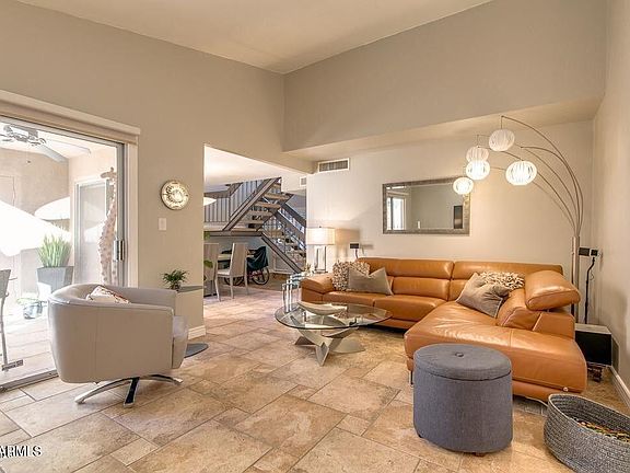 Best floor plan in the community! Vacant with a deep clean and new paint - move in ready! Bright and open lock and leave loft-style patio home with high ceilings and a contemporary flair. Well maintained with updated kitchen and baths, stainless appliances and lots of closets and storage space.Large great room opens to a private patio with gate to large grassy common area,community pool, spa and clubhouse. Upstairs primary bedroom and ensuite bath with two bedrooms and shared full hall bath. Downstairs powder room and laundry room. Steps from the Greenbelt for easy access to walking and bike paths. Heart of Scottsdale - minutes to the Loop 101, Old Town, prime shopping and dining and professional sporting events.