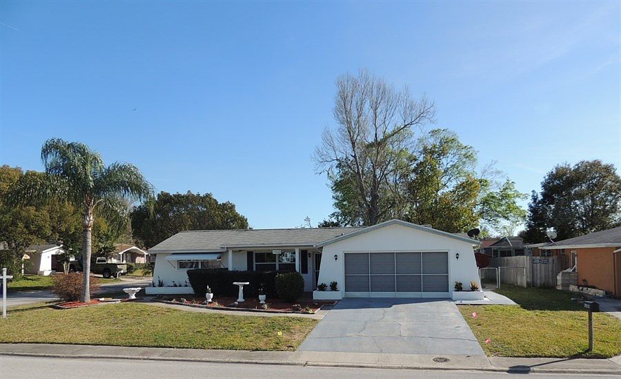 Completely remodeled and put together with a super clean look... Welcome to this beautiful large open floor plan with two bedrooms two family rooms and a sun room that could easily be used as a third bedroom or office. Everything has been renovated and thought of, and some of the upgrades include the following: brand new matching and efficient appliances, vinyl windows and new screens throughout, 2 car garage with screened enclosure, new fixtures and other various plumbing enhancements, earth-toned ceramic tiles for easy cleaning and upgraded baths also to include new vanities, fixtures, mirrors and tiles. The kitchen received a full makeover with cherry colored cabinets and new counter tops. The fully enclosed sun room has been completely refinished and looks out to a lovely backyard complete with shed and fence. The home sits on a large corner lot that encompasses an inviting, mature, landscape with many plants, flowers, bird baths and fresh mulch. Don't miss out on this hidden gem because it's move in ready and houses done this well are few and far between in this area. The New Port Richey Rec Center is less than 2 miles away from the property and offers 3 pools, basketball and tennis courts, a gym and skateboard park, and many other physical fitness activities. The neighborhood is considered golf cart friendly with an optional $25 HOA fee and sits adjacent to Magnolia Valley Golf Course (currently in foreclosure) but that should just mean that ownership is about to change. Relocating from up north? ~ this home would serve as the perfect retirement paradise even for someone in a wheelchair because it has a wrap-around concrete path that completely circles the entire yard!