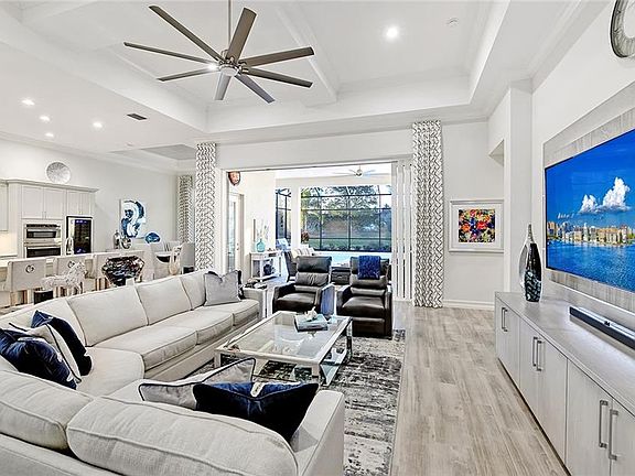 With unrivaled attention to detail, this custom residence is a lavish showcase of award-winning design, superior finishes and master craftsmanship. From the tray ceilings, crown moldings, spectacular wood-like ceramic tile floors and designer windows treatments, one will be impressed. Make your way to the stunning kitchen, featuring exquisite wood cabinetry, an oversized island with quartz countertop, high-end appliances which include a 150-bottle wine refrigerator and oversized breakfast nook with tongue and groove inlay ceiling. Just open the disappearing sliders from the great room with the custom designed wood built-in showcasing the TV is an ideal centerpiece. You will be captivated by the large lanai with outdoor kitchen, Pebble Tec pool with spa, and fire pit while enjoying absolute privacy and tranquility. The master suite is an absolute oasis with custom closets and a luxurious master bath with walk in shower with sandblasted glass enclosure and elongated vanities. With two guest rooms featuring en-suite baths and a private den with bath which could easily be a 4th bedroom, make this perfect for family gatherings. Other notable features include large 3 car garage, separate dining room, LED recessed lighting, Impact windows and built in desk in back hall. For the one who is unwilling to compromise, this is absolute luxury at its best.