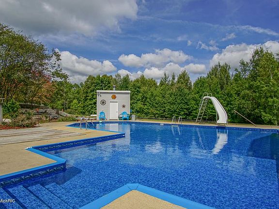 Welcome to this spectacular executive estate! Located only 15 minutes of pavement from Big Rapids, and set on 10 acres of incredibly unique property, by the award winning salmon/trout Pere Marquette River. Let's start with the home, built with quality and character in mind, and chock full of hard-to-find features. HUGE saltwater pool with outdoor bath, wet/dry indoor Sauna, three levels of decks, and stunning elevated views all around. In-floor heat, walkout basement with wet-bar..absolutely perfect for entertainment! Did I mention the sumptuous master suite, with private bath, walk in closet, and private office/entertainment area? 2+ car attached, and 2+ car unattached garage. First-class hunting, and excellent hobby/horse farming set-up on this property. Call today!