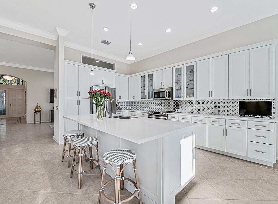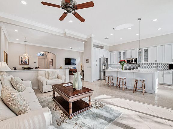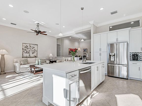 A DREAM LAKESIDE HOME! This stunning open concept 4 Bedrm home is nestled on a picturesque,pie shaped cul de sac lot with beautiful curb appeal! A newly remodeled kitchen is ideal with all white wood cabinets, quartz counters,stainless appliances,chefs island,eat in cafe space overlooking peace & serenity! With the wall down this custom Gibraltor model has neutral flooring,great closets,4 bdrms with bedrm 4 being used as an office. PLENTY OF ROOM FOR A POOL! Walk to State of Art Fitness Center! ENJOY 10 tennis,6 pickleball,3 Bocce crts,plus 2 indoor racquetball crts,Social tropical pool,water aerobics, lap,&resistance pools, indoor whirlpool,hot tub,so much more!Beauty salon,massages,clubs,shows,full time social director&Tennis/pickleball pro,amenities galore!Live the Valencia Life! LOVE!