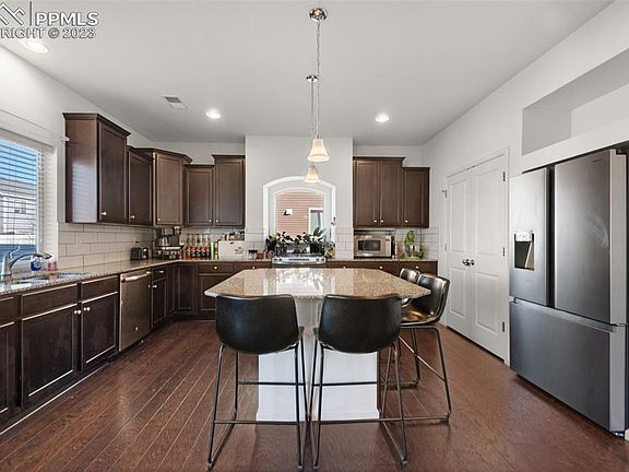 As you step inside you are greeted with an open floorplan. The inviting flex room can be used for an office or dining area. The kitchen is a chef's dream, featuring gas stove, a spacious granite island for seating up to four, a pantry, granite countertops, and ample cabinet space. The built-in hall tree near the half bath and garage entrance adds a touch of practicality to keep your space organized and clutter-free. Upstairs, discover a delightful loft, all four bedrooms, and an exceptionally large laundry room for added convenience. The spacious primary bedroom boasts a spa-like walk-in shower and a generously sized walk-in closet, providing a perfect retreat at the end of the day. While the other bedrooms are set to other side of upstairs with easily accessible upgraded bathroom. Step outside to the fully fenced backyard with raised beds, creating a private oasis for relaxation and outdoor enjoyment. This home is not only a sanctuary but also conveniently located near Fort Carson, Peterson Space Force Base, parks and trails. Don't miss the opportunity to make this your dream home, blending luxury, comfort, and convenience in one desirable package. Schedule your showing today and experience the best of Colorado living!