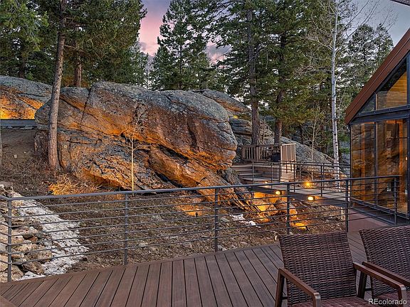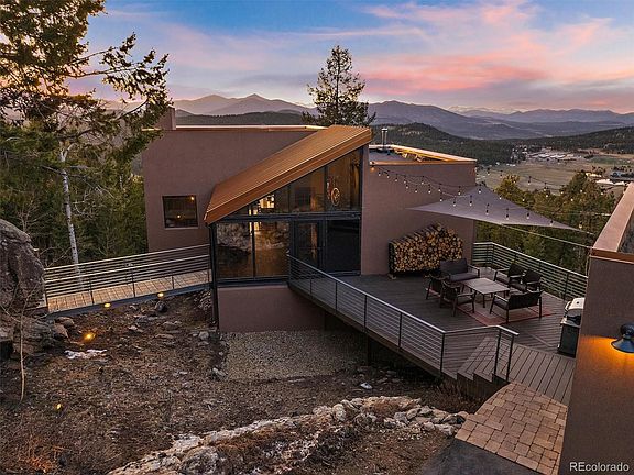 Sitting on one of Evergreen's Very Best View Lots, you will find this absolutely Stunning Mountain Contemporary on 4.02 private acres with BREATHTAKING MT EVANS & CONTINENTAL DIVIDE VIEWS! Located in sought after Evergreen Meadows, this is a super rare find! The views start from the Front Composite Deck that takes you to the amazing Foyer with dramatic beam vaulted ceilings, heated floors, cedar closet, half bath and floor to ceiling windows. On to the Great Room with a wall of windows and patio doors that fill with those endless views. Bamboo hardwood floors and the reclaimed timber & stone Fireplace add the perfect warmth to the Great Room. The open Kitchen is a dream. Custom Alder Cabinets with all the high-end touches. Entertainer's Island, Beautiful Quartz Counter Tops, Under Cabinet Lighting, Stainless Steel Appliances, Double (Convection) Ovens, Convection Microwave, Designer Fixtures and more. Walk out to the front Deck and see for miles. The Main Floor Primary Suite has a beautiful Full Bath with heated floors. Down one floor you will find the open Family Room. (With those same views!) A spacious bedroom with Candle Fireplace. Third spacious bedroom. And a huge 4th Non-Conforming Bedroom. (Makes a great office or work out room.) A Remodeled Full Bath with heated floors and the Laundry Room with sink completes the lower level. The Basement features a Bonus Room, full bath and small living area. It also has direct access to the outside. (Mini-apartment, office, work-out, studio, or?) Other features include: Solid Knotty Alder Doors & Trim. Efficient Hot Water Baseboard Heat. Custom Lighting, Built-In speakers. Rise Broadband Internet. PLUS: Huge 4-Car Garage & mega off street parking. Stunning Rock Outcroppings and an awesome Gazebo. Over the last 15 years the owners have loved this property. Remodeled, Updated and Upgraded this home from top to bottom. Owning a property like this comes along once in a lifetime!
