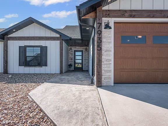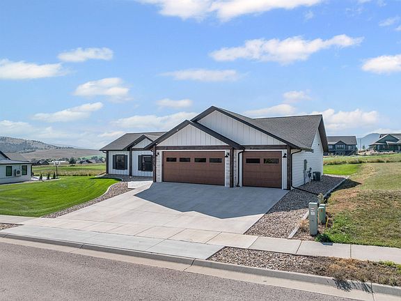 Listed by Jenni Sneesby - 605.645.1181 - Engel & Völkers Black Hills. This stunning, modern home offers zero-entry access and a premier location on the 8th hole of Elkhorn Ridge Golf Course with views of the Black Hills. Custom-built with high-end finishes throughout, the home features hickory hardwood floors in the entry, hallway, living room, and kitchen, with carpeted bedrooms and tile in the bathrooms, mudroom, and pantry. The kitchen includes Cambria quartz waterfall countertops and a hidden pantry, while the living room showcases a high-output linear gas fireplace with a large-format tile surround. The guest bathroom includes a tiled tub surround, and the primary suite offers a fully tiled shower with dual rain heads, two built-in niches, and a spacious walk-in closet. Residents of the Elkhorn golf course have access to the Elkhorn RV resort which includes pool and hot tubs, basketball courts, tennis/pickleball courts, and a playground.