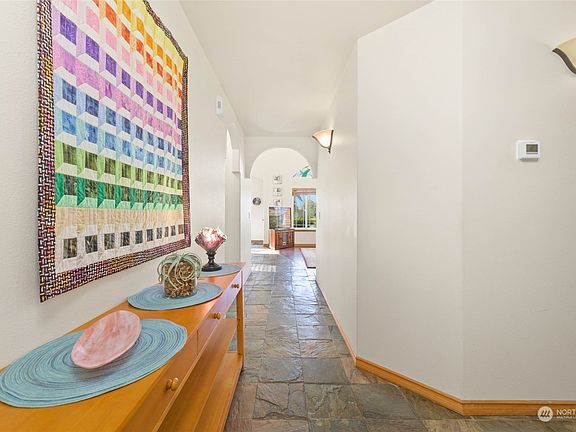 Welcome to this charming 3-bedroom, 2-bathroom stone-clad home in the gated Sealinks community of Birch Bay. This bright, open-concept, single-story home offers stunning golf course views and is just a short walk from the beach. The living room features a stone-clad gas fireplace, while the adjacent kitchen includes ample storage, a large island, and access to a spacious deck. The fully fenced backyard is perfect for outdoor relaxation, surrounded by year-round Pacific Northwest landscaping. The primary suite has an en-suite bath, walk-in closet, and deck access. Updates include a new roof, paint, and furnace. High-end finishes and a double-car garage complete this beautiful home at 9735 E Golf Course Drive, Blaine, WA 98230.