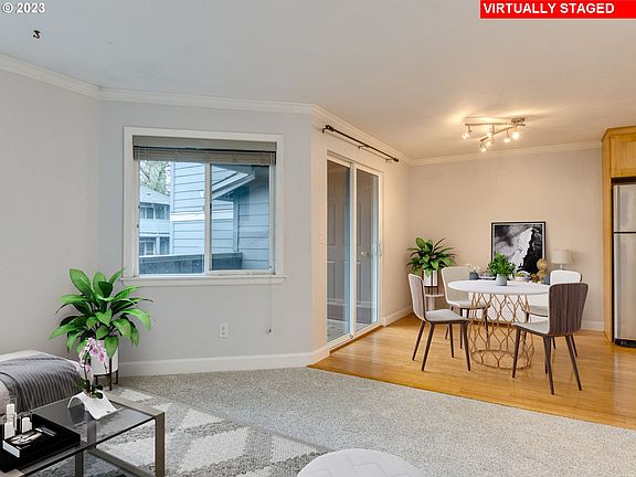 Light and Bright Multnomah Village Condo - just blocks from 90-acre Gabriel Park and Multnomah Village restaurants, shops, and amenities. This gorgeous two bedroom/two bath unit features a spacious open floor plan. Fresh paint and lofty third level territorial views add to its airy feeling. Enjoy one of the rare wood-burning fireplaces in the complex. Crown molding throughout the main living area. Maple cabinetry and bamboo floors in the kitchen and dining area adjoin new carpet throughout. The cute private patio also has a huge outdoor storage closet. Primary bedroom features an ensuite bathroom and walk-in closet. Two parking spaces under carport, directly across from building front door with available designated visitor spaces. Washer/Dryer included in tucked-in closet. HOA includes so much: sewer, water, trash, exterior building and landscape maintenance, common area cleaning, meeting room usage, and beautiful POOL and JACUZZI! This unit is a MUST SEE for first time buyers, downsizers, or investment property seekers.Open House: Saturday, December 9 and Sunday, December 10, 1-3pmShowing Availability: No restrictions, all open (except open house times)