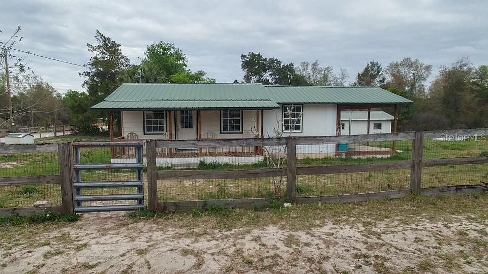 2 bedroom 1 bath cabin with smaller front porch and larger side porch. There is laminate flooring in kitchen & dining area, carpet in bedrooms and living room. Cabin has metal roof and a large detached garage with W/D hook up. Garage has doors on each end, concrete floor and has a metal roof. There is a 5 ton central heat and air unit ( too large for cabin) and is not connected. Owner just put in a new 4" inch well. There are 5 fenced lots with 2 gated entrances. Price reflects that the home needs work and needs cleaning. Lake George (M-Port Marina), Silver Glen Springs and Salt Springs are only minutes from prop