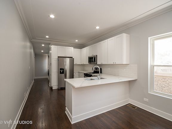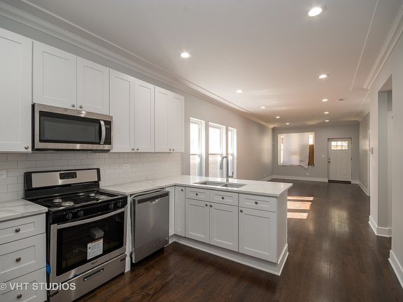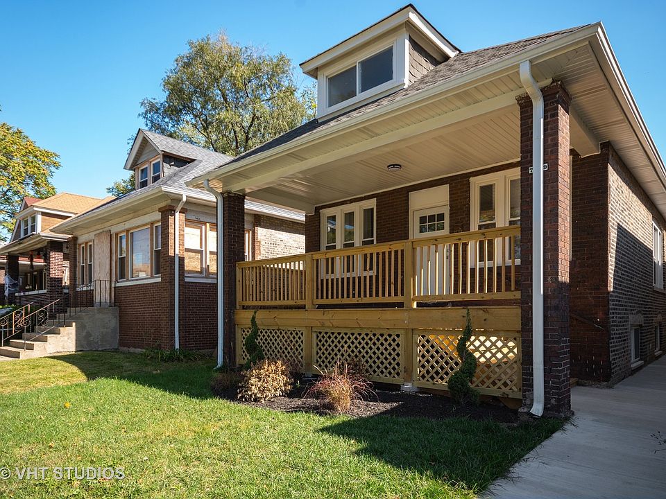 Welcome to The Ridgeland! Exceptional full gut rehabbed brick bungalow in the South Shore area just minutes from expressways and the proposed President Obama Library. Quality craftmanship was not spared when this home was rehabbed. This extraordinary home features 5 bedrooms(2 on the main floor, 2 upstairs and 1 in the basement) and 2 bathrooms. The main level boasts new beautiful hardwood floors throughout, 10ft ceilings, an open kitchen concept, high end Quartz countertops and brand new stainless steel Whirlpool appliances. The upstairs has 3 skylights to maximum day sunlight and 2 spacious bedrooms. Full walkout basement includes waterproof floors, a large bedroom, bathroom, additional living area and a laundry room. NEW windows, NEW deck front and back, NEW roof, NEW garage, NEW HVAC, NEW AC installed before closing. HUGE backyard! This home is ready for you to move right in!