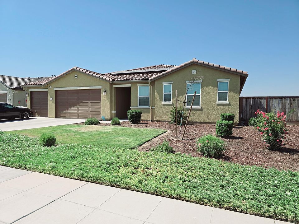 Welcome to your dream home in the serene town of Fowler. This beautiful home, built in 2022, is move-in ready and waiting for you to create lasting memories. Featuring 5 spacious bedrooms with high ceilings and 2 modern bathrooms, this home offers ample space for your family to thrive. As you enter, you are greeted by a long hallway that leads you to the heart of the home—the family room. The open floor plan seamlessly connects the kitchen, dining area, and living room, making it perfect for hosting gatherings and ensuring that everyone remains part of the festivities. The kitchen boasts stunning granite countertops, stainless steel appliances, including a microwave, dishwasher, and gas stove, and a convenient walk-in pantry. The island serves a dual purpose, providing an ideal space for food preparation and a cozy spot to enjoy breakfast. The primary bedroom is a true retreat, featuring a large window that offers a lovely view of the backyard. The primary bathroom is equally impressive with a walk-in shower, his and her sinks, and a spacious walk-in closet. Each additional bedroom is generously sized, reflecting the thoughtful design and quality craftsmanship of this nearly new home. Step outside to the backyard, where young plants have been carefully planted, promising to grow into a beautiful garden oasis where you can enjoy BBQ under the covered patio. One of the standout features of this property is its fantastic location. The elementary, junior high, and high schools are conveniently situated just outside the subdivision, allowing kids to walk to school with ease. This home also comes with several energy-efficient perks, including solar panels, tankless water heater, insulated three-car garage doors, an Ecobee thermostat, canned lighting, and dual-pane windows, which all contribute to comfort and cost savings.