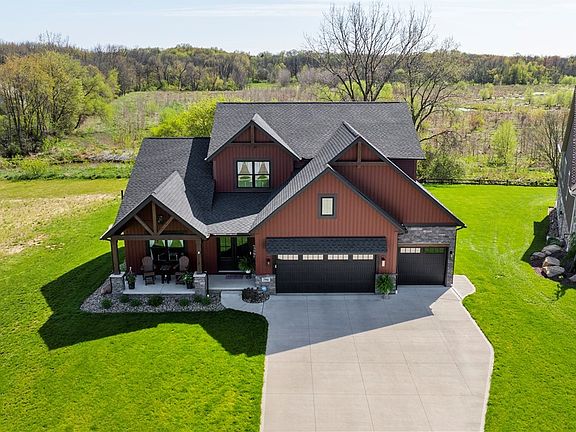 Beautiful one owner modern farmhouse build from Grisez Homes. This incredible home can be found in the highly desirable Lake school district’s allotment, The Woodlands. This custom built floor plan is move-in ready, ready for memories to be made. This home has it comes equipped with, but not limited to, an oversized three car garage, an inviting front porch, as well as a large, covered deck and walk out finished basement. Off the finished basement, you will find a nice patio to enjoy your private, peaceful and quiet back yard. This modern plan has a first-floor master suite with custom tile shower and large walk-in closet. Three additional spacious bedrooms are located upstairs. The fifth bedroom can be found in the finished basement with egress walk-out. In the great room you will find incredible, tall ceilings with tons of natural light as well as view and fresh air, provided by the walls of sliding glass doors that make this home truly unique. This well thought out floor plan has a home office, den or flex space in the front of the home, as well as a pocket office for a secondary home workspace. This home won't last long. Make it yours today!