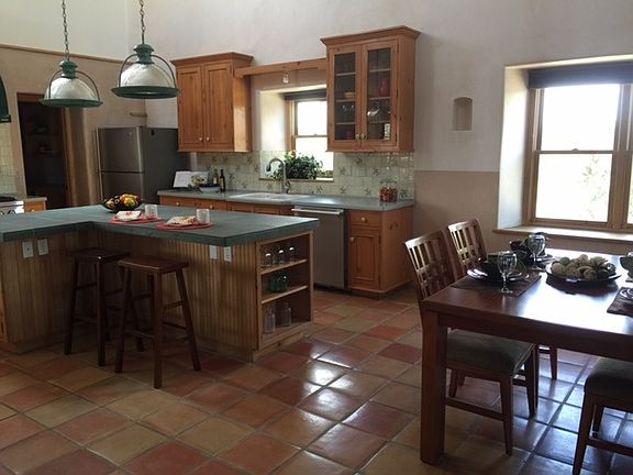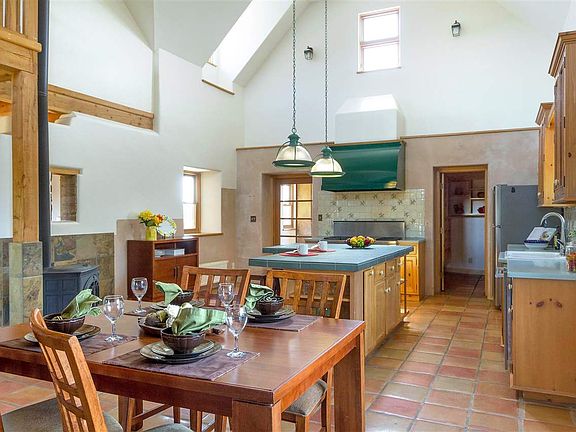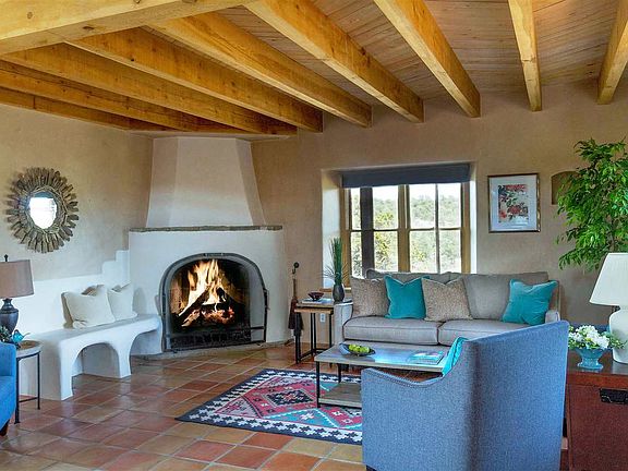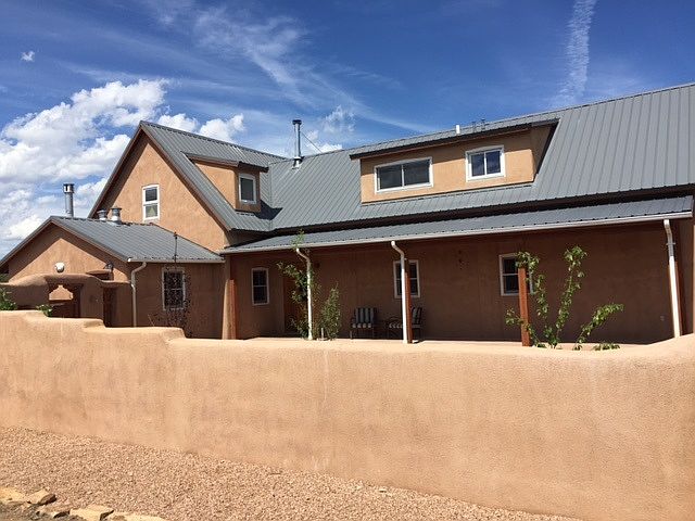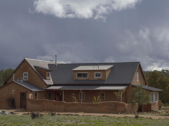 This is an Exquisite Pitched Roof Home whether you have horses or not! With breathtaking views on 50+ acres, it is truly a charming property! The main house has an open concept living room, gourmet kitchen, pantry, large fireplace, high ceilings, loft, walk-in closet, plaster walls, wood burning stove, tile and wood floors, enclosed courtyard and portal. The pitched roof guest house is perfect for guests or an office/studio, Completely off grid with high-tech solar system. Satellite provides internet, cable TV. There is a 5-stall heated horse barn with tack room, turn out arena and a hay storage as well as other outbuildings. Only about 30 minutes from town. A dream property!