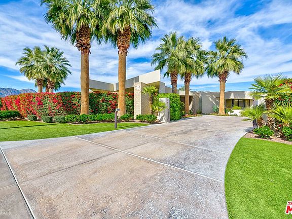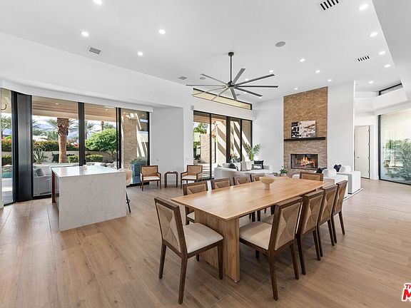 Welcome to paradise! Newly remodeled and just newly furnished custom 5 bed/5.5 bath Contemporary home located in the exclusive The Estancias gated community of only 49 custom properties in prime La Quinta location, close to Old Town, La Quinta Resort & some of the desert's finest world-class golf courses. Situated on a large 28,000+sf lot with private gated driveway, this home exudes the resort lifestyle with incredible indoor/outdoor flow, stunning modern designer finishes throughout and entertainer's backyard. Main home includes 3 bed/3.5 bath with detached 2 bed/2 bath casita (with fireplace, breakfast bar & fridge) located off of the home's inviting center interior courtyard featuring a beautiful spa and tranquil waterfall. Formal entry with powder room opens to spacious living room with entertainers bar & dining table for 10. Large family room opens to breakfast room & open chef's kitchen with quartz countertops, center island with waterfall edge & breakfast bar and walk-in pantry. Living room & family room all opening to relaxing beautifully landscaped backyard including covered patio with misting system, newer patio seating areas, fire pit, lounge chairs, built-in BBQ and Pizza oven and incredible over-sized sparking pool all overlooking beautiful mountain and sunset views. Primary suite has a separate wing off living room with fireplace, walk-in closet, gym that includes Peloton and spa-like primary bathroom with separate bath/shower. Additional features include porcelain wood-like tile throughout the home, 4-zoned ac/heat, newly installed 75" & 85" televisions and Sonos sound system throughout, ceiling fans in every room, all bedroom with ensuite bathroom and full-size laundry room with sink. Price may vary depending on month.