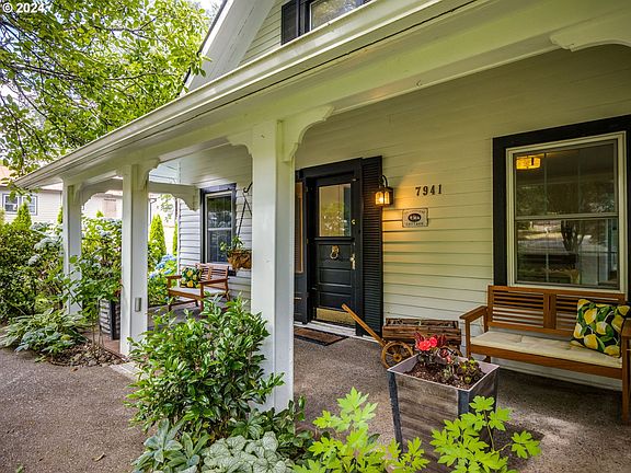 Welcome to the Garden Home Cottage. Established in 1920, this vintage home is well cared for and is in search of its next loving owner. This farmhouse style cottage nestled at the end of a quiet street is truly a gardener's dream. Upon arriving you are greeted by a shaded pathway lined by lush greenery which leads to the nostalgic covered front porch. There is a large variety of flowering plants surrounding the house that bloom throughout the spring and summer. Currently the Hydrangeas are on full display. Through the front door you will enter the living room with its high ceilings, built in entertainment center, crown molding, Bamboo flooring and filled with natural light. Proceed toward the back of the house to the cook's kitchen and its custom wood cabinetry, pot rack over the range, pantry, and butler's pantry with tons of potential. Just beyond the kitchen is the dining/family room with vaulted ceilings, a modern ceiling fan, handsome wainscoting, a wet bar, built-in display cabinets, and French doors that lead to the maintenance free wrap-around deck. The deck has a step down seating area surrounded by planter boxes perfect for small outdoor gatherings, room to barbecue and full access to both the backyard and the rear of the driveway. After your gathering, retire back inside past the recently remodeled bathroom and up the stairs to the primary suite. This private area has built-in shelves going up the stairs which open into a large room bathed in natural light from the windows and skylights within. There is a full dedicated bath, a window seat, wall sconces, and an oversized walk-in closet with a window that overlooks the garden beds and the garden shed below. All of this with a 24'X26' unfinished basement will give you all the room you need. Call to schedule a private showing today if you're interested in becoming the next caring owner of this unique vintage property. [Home Energy Score = 1. HES Report at https://rpt.greenbuildingregistry.com/hes/OR10230317]