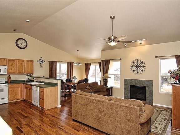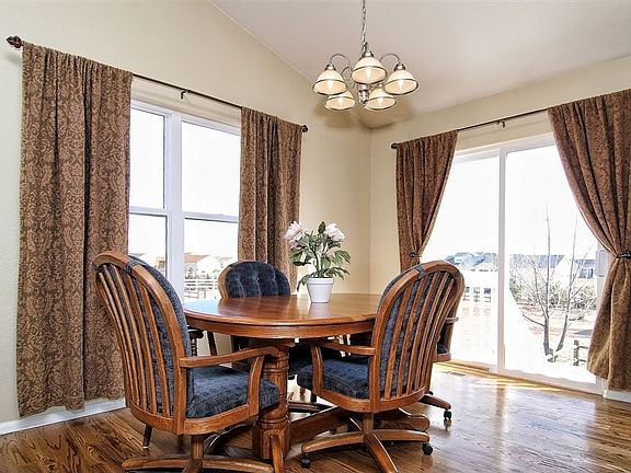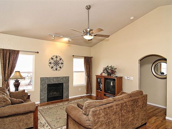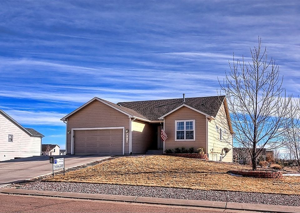 Immaculate 5 bedroom, 3 bath rancher on a great 1/2 acre lot in Woodmen Hills! Landscaped with over 50 trees on a drip system! Open floor plan boasts neutral colors. The main level has newer hardwood floors and vaulted ceilings throughout. Relax in the great room with a gas fireplace which is open to the dining area & spacious kitchen. The kitchen includes a counter bar & walk-in pantry. The Master Suite includes a walk-in closet and 4 piece bath with a soak tub. Two additional bedrooms and a full bath completes the main level. The finished walk-out basement boasts a huge family room, 2 bedrooms, full bath and 2 finished storage areas which could be an office or homework space. Additional amenities include upgraded light fixtures, security system and humidifier. Wonderful flat yard with a fenced area with a patio plus a level spot with a play set and a trampoline. Extra concrete parking space and plenty of room for an outbuilding. Great location near schools, shopping and military installations. Recreational style community with access to 2 rec centers with pools and excercise area plus lots of trails and open space around the community.