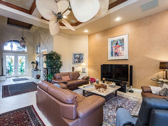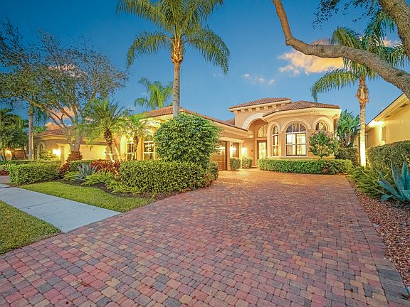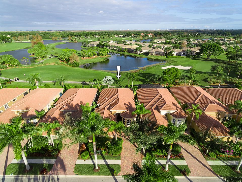 Enjoy golf and water views while living in paradise in this very special, luxurious, 3BR/3BA + Den open-plan estate home situated on the 3rd fairway of the Tradition course in the prestigious private community of The Club at Ibis. High-end features include volume coffered & tray ceilings with crown molding & recessed lighting, high-end engineered wood flooring & porcelain flooring laid on the diagonal, granite countertops, a coral fireplace, sound system throughout, stained glass, newer stainless steel appliances, and large windows and sliding glass doors. The patio is an outdoor oasis and has a covered seating area, retractable awning, a swimming pool with attached spa, and paver flooring.