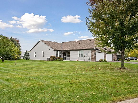 Beautifully updated and meticulously maintained single-level end unit townhome in Otsego's desired Prairie Creek neighborhood. This one-owner, slab-on-grade home offers easy main-level living with wide hallways and doors, engineered flooring in the kitchen and entry, and plush carpet throughout. The kitchen features granite countertops, stainless-steel appliances, and a brand-new microwave (September 2025). Enjoy the cozy three-sided gas fireplace between the dining and family rooms and a bright sunroom leading to the private back patio. Additional highlights include a new roof, siding, and skylight (June 2025), a brand-new dryer (October 2025), and mechanical systems professionally serviced annually. Spacious attic storage above the garage adds convenience. The HOA covers lawn, snow, sanitation, and exterior maintenance for truly easy living.