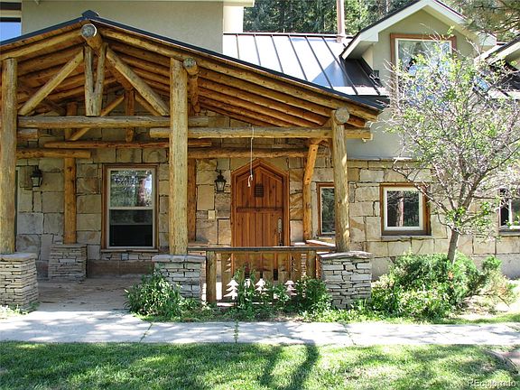 Detailed, sprawling, and classic layout found in no other Mountain retreat sitting minutes from Hwy 285 and 8 miles to C-470. This expansive Retreat features intricate wood and stone style emphasizing a layout that feels as if nothing else exists outside its solitude. While featuring its own meadow on its luxurious 5.46 acres, it also boasts its own pond fed by a natural spring for fresh mountain water, adding its tranquil sound to the quiet peace of the land. It greets with a large, paved drive as it winds its way over its creek bridge and reveals the grandness of the stone façade and beautifully coordinated solid metal roof, bringing both style, security, and its own subtle majesty. Incorporated into its modern amenities is the Original log cabin that stood proudly on the site in the late 1800s. It cunningly melds its history with its stunningly peaceful and expansive gourmet kitchen that savors its expansive counters and storage space surrounding the large island center space, enabling the gas range burners to function between electric cook tops on both sides enjoying ample counter space, allowing the chef to freely look around the detailed designs and walk around feeling the openness of the surrounding land. Kitchens high exposed-beam ceilings surrounded by chinked logs walls lift the spirit of creativity. Main house features custom made wood doors with vintage-style arched pointed tops. Some of these stunning doors feature glass panes with deep colors bringing warmth into their rooms. The main gas fireplace in great room adds a water feature which mimics the sounds of the creek just outside. Main house radiant heat in main floor and upstairs, plus two gas furnaces with A/C as backup to always meet what is desired. Three tankless water heaters, two in main house and one for garage and living area over garage. The newer expansive 4 car garage with living area is attached to main house by enclosed walkway. Newer barn with a basement has ample space for many uses.
