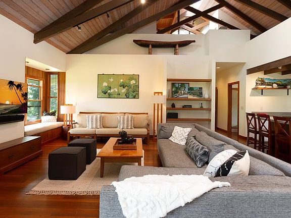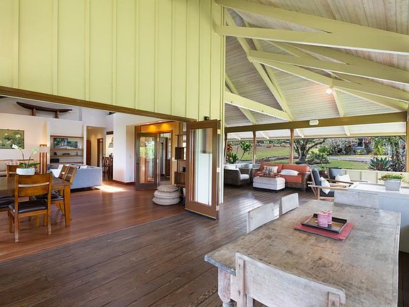 This remarkable agricultural estate has everything you want on a small farm in Haiku! The main home is an architecturally designed craftsman built home, stylistically it’s a blend of mid-century modern and contemporary. It has a huge roof that shelters large lanais that wrap around two sides of the house, this provides for indoor-outdoor living much of the year. The lanais are wonderful open vaulted spaces ideal for entertaining or just chilling, and they almost double the livable size of the home. The outdoor space flows into the Great Room with its teak floors and vaulted ceilings. The Great Room has a beautiful fireplace, a cozy reading nook, kitchen, and ceiling dormers that have stained glass features allowing natural light to flow in which highlights the richness of the teak floors and other wood accents. The bedrooms, laundry and mudroom are down the hall leading to the other end of the house, and upstairs there is a fully finished loft office space. The home also has a luxurious outside bath enclosure with shower and tub surrounded by lush tropical plants and orchids. The newly renovated cottage has a sleek fresh new look, and it also has high ceilings and a fireplace. The cottage is a 2/1 ohana with a two-car carport, front and rear lanais and an outdoor shower. The third and forth buildings include the three bay utility barn and art studio, which provide four workshop spaces for many hobbies, trades and passions to be pursued. The two large fenced pastures include two small barns for horses or livestock. The property has many fruit trees including: lychee, avocados, multiple citrus, macadamia nuts, bananas, ulu, and many others, as well as tropical landscape trees like the perfume flower tree Pua Keni Keni, Kukui and rainbow shower trees. Listor is Seller