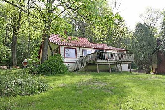 Enjoy Fabulous Okemo Views: This antique cape, built around 1850+/-, sits on one of the nicest waterfront parcels on Lake Rescue. Huge views of the ski trails on Okemo Mountain Resort and a sprawling flat yard slopes slightly down to the lake. Southwesterly exposure offers sunny, fun-filled days swimming, fishing or playing games on the grassy lawn. If only the walls could talk, one can tell the care that went into its construction. There are clever built-ins throughout the house that add character and maximize storage. Large living room with wood stove has sliders leading to the three-season porch with large windows and sliders that look out over the deck and lake. New shared septic. There's a lot to love and a ton of potential with this property. Renovate or build your dream lake house. (Sale subject to final subdivision of parcel).
