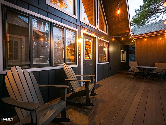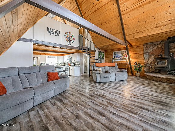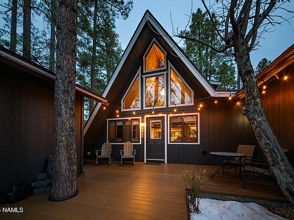 Welcome to this beautifully remodeled 3-bedroom, 2-bathroom A-frame cabin in Munds Park, where no detail has been spared. Stepping inside, you're greeted with vaulted tongue-and-groove ceilings, a cozy wood/pellet-burning fireplace, and engineered hardwood flooring throughout. Both the kitchen and bathrooms have been fully updated with new appliances, contemporary finishes, new lighting, and fixtures. Key updates include a recently replaced roof and a brand-new Tesla solar system with a 40-year transferable warranty. The electrical panel and circuits have been upgraded, and the furnace was replaced, along with the addition of a mini-split AC for year-round comfort. Outside, enjoy relaxing on the Trex decking, a fully fenced yard with low-maintenance landscaping, or soaking in the hot tub. This home also features a newly painted exterior, two garages and plenty of off-street parkingproviding both convenience and functionality. With a perfect blend of modern amenities and rustic charm, this cabin is a true gem.