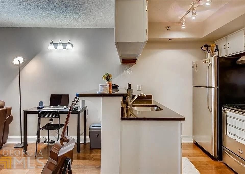 MOTIVATED SELLER!! $4,000 concession if buyer pays $168,000. Beautifully renovated condo(studio) in the heart of the most desirable and prime Sandy Springs, GA location. Sun filled with panoramic city views from the balcony. Unit has one assigned deeded parking spot in the attached gated garage, which is very desirable due to limited spots and not all units coming with deeded spots. This unit has new hardwood floors, a fully renovated kitchen including quartz countertops and stainless-steel appliances, new lighting and cabinetry, bathroom with new master vanity including marble countertop, new shower head, updated and large closet with shelving, and new designer paint throughout. This condo comes with a garage parking spot and building storage unit, including bike storage. Resort-style living all within the building including a fitness center, laundry room, dry cleaners, convenience store in the building. The building also has a concierge desk with 24-hour staff. Residents can also use the clubhouse located in Eva and reserve for any party. Outdoor amenities include a resort-style pool with cabanas, spa, grilling area (2 large stainless-steel grills), and dog parks. Hammond Park is located just next door with a connected entrance and walking trails, soccer fields, basketball courts, tennis courts, and a lot of other amenities. This unit is EXTREMELY SOUGHT AFTER due to it being on the 4th floor! No long elevator wait times and quick access to assigned parking. Very convenient for visiting guests, bringing in groceries, taking the dog for a walk, and just steps from the 5-star amenities. Direct entry into Hammond Park! Quick closing available! This is a MUST SEE!