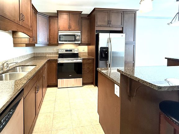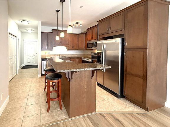 Entertainer’s Kitchen: Granite island with raised bar (bar stools included), stainless steel appliances, and extra pantry storage.