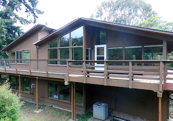 Contemporary retreat sequestered on 5 acres of forested privacy. Warm east side of Bandon. Dramatic high ceilings set tone for Oregon magical living with spectacular views through incredible window walls of Rhodies, Azaleas, fruit trees & forest. Two Baths and two bedrooms on main floor with wraparound decking. Lower level has office/bedroom, bathroom, and large family room with propane stove and workshop. Huge RV port, raised garden