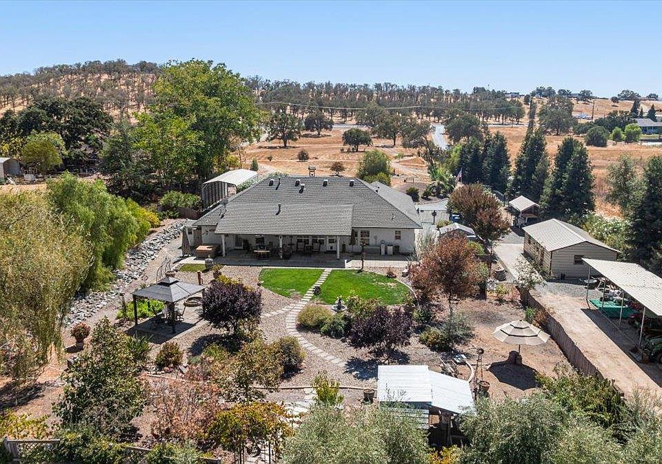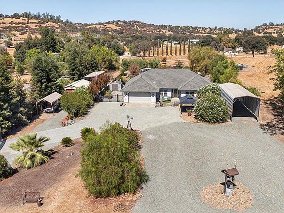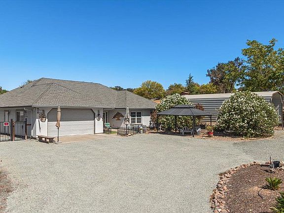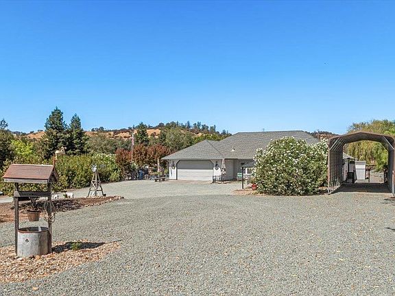 Hard to find single story custom built home on usable 5 acres with a 18X35 metal shop, 40 ft metal RV cover, 40X12 metal carport and detached boat storage. This quality home features an open floorplan with formal entryway, living room boasting a gas log fireplace on raised hearth with rock surround and built in display shelves. The kitchen is the centerpiece of the home with large raised countertop island, SS appliances including double oven, 5 burner gas cooktop and trash compactor. Formal dining area, inside laundry room, walk-in pantry, possible 4th bedroom with attached full bath, two spacious spare bedrooms, hall bathroom, primary suite with outside access and primary bath with walk-in closet complete the floorplan. The fenced back yard is an oasis with large covered patio, personal spa, lawn area, a variety of mature trees, grape vines, gazebo, firepit, chicken coop and storage sheds. Property is fully fenced with front pasture area for large or small animals. Live where you play just minutes from 3 beautiful lakes, hiking trails and La Contenta golf course. Location is perfect for an easy commute to the valley.