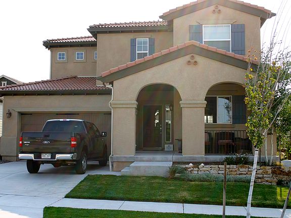 Back on the market! Open & bright Spanish style stucco home w/covered front porch facing the mountains, 3 car tandem garage. Dark oak hardwood floors, 9 ft ceilings, large eat-in kitchen w/upgraded cabinets, tile counters and tile backsplash, plantation shutters, large living room w/fireplace, walkout to landscaped yard w/semi-circular stamped concrete patio. Open staircase a/accent windows leads upstairs to 3 bdrms, full bath, master suite w/5 pc bath, laundry. Bsmt has wet bar, 4th bdrm (no closet).