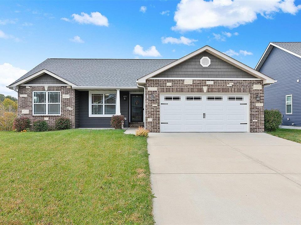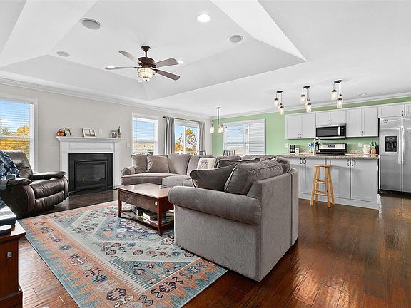 Fall in love w/this craftsman ranch w/stunning fall foliage views! Step into the open concept living room w/coffered ceiling, LVP flooring & gas fireplace that is just steps from the chef's kitchen & eat-in dining area. This kitchen boasts custom cabinetry, a huge prep island w/breakfast bar seating, solid surface countertops, stainless steel appliances including a gas range & walk-in pantry! The spacious master suite offers lots of natural light w/walk-in closet & ensuite bath w/dual sink vanity & tub/shower combo. Two additional bedrooms & full hall bath along w/main floor laundry add functionality to the first floor. The walkout basement is partially finished & perfect for the family entertainer w/a large family room prewired for surround sound & a wetbar! A bonus room, full bath & 4th bedroom complete this spacious lower level that walks out to the large patio. Spend your evening enjoying the sunset and changing of the seasons from the deck w/pergola because this home is turn-key!