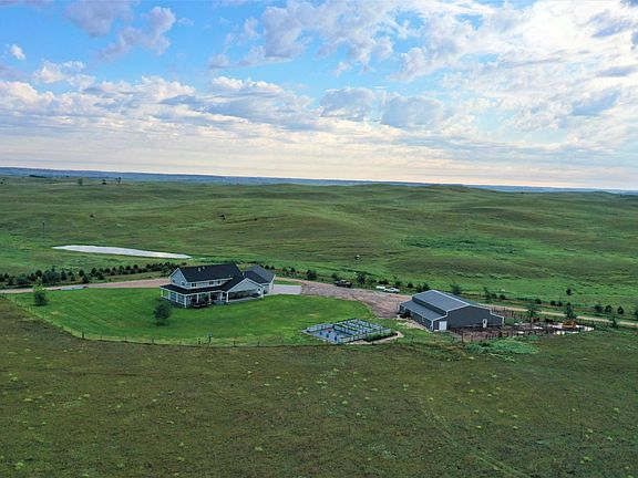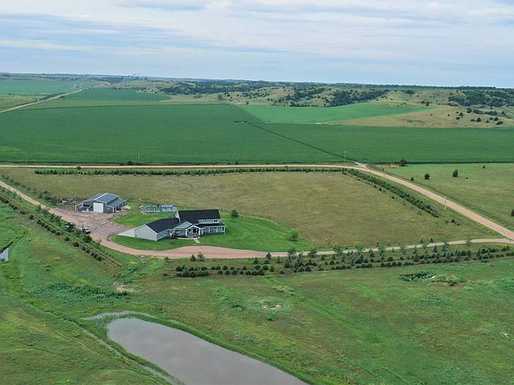Built in 2013, on a quiet 14 acres just five miles south of Arnold, NE sits a stunning custom-built 3,852 sq. ft. home. This current family home is set up to be a bed-and-breakfast with a total of seven bedrooms, five bathrooms, and a home office! Coming in from the three-car garage is a large laundry room and full bath to clean up after a long day. Across the hall is the home office with a window overlooking the front yard and driveway. The fiber optic cable that was recently installed gives you high-speed internet all throughout the house. The grand living area features a beautiful stone fireplace across from the kitchen filled with custom-built mahogany cabinets and stainless-steel appliances. The large island seats six around the farmhouse sink, with a second sink looking out over the patio. Adjacent to the kitchen sits the dining area with a coffered ceiling and access to the 1,312 sq. ft. covered patio. Through the hallway, under the grand stairway, you will find a guest bedroom and a full bath. At the end of the hall is the master bedroom with a large walk-in closet, an ensuite bath featuring the same custom-built mahogany cabinets as in the kitchen, and his-and-her sinks. As you top the stairs you will find a sitting area overlooking the main level's living space. Three more bedrooms and one full bath are also located upstairs. Walking down the stairs into the finished basement you find another beautiful stone fireplace to gather around as you settle in for a family movie night or the big game! A full kitchen is situated just around the corner with a large space surrounding it, currently used as a game room. A full bath, two additional bedrooms, and a utility room are all located in the basement area as well. Recessed lighting and a built-in stereo system throughout the home make it easy to set the mood for any occasion! As you make your way outside to the wrap-around porch, you will be delighted to see the beautiful green grass year after year watered by the underground sprinklers in the front and back yard. There is a raised garden bed in the backyard for easy maintenance to grow vegetation and ornamental flowers. The abundance of trees planted along the boundary lines in 2012 are already creating a great shelter and privacy line for the property. A 3,780 sq. ft. concrete floor shop/barn with a large overhead garage door is situated just to the south of the house. A heated storage room sits at the front of the building for easy access. Four outdoor runs are attached to the indoor pens that are all connected to the roughly six-acre lot, perfect for a couple of horses, cows, or any 4-H project one might desire. Five hydrants and water tanks are spread throughout the property.