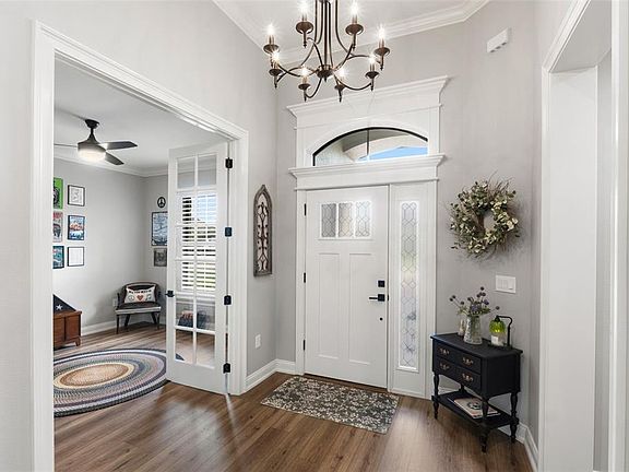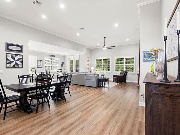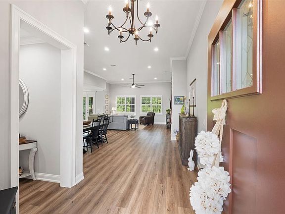 BETTER THAN NEW! This stunning Ernie White-built home is less than 2 years young and sits on a premium, private lot in the beautiful gated, 55+ community of Lake James. With nearly 2,000 sq. ft. of living space, this 2-bedroom, 2-bath home with an office (easily used as a 3rd bedroom) offers comfort, style and a thoughtfully designed layout. From the moment you step inside, you’ll be impressed by the soaring 12-foot ceilings in the main living areas, enhancing the open and airy feel. The remainder of the home features 10-foot ceilings, creating a sense of spacious elegance throughout. The living and dining spaces flow seamlessly into a well-appointed kitchen boasting white cabinetry, quartz countertops, an upgraded stainless steel appliance package and a breakfast bar. Enjoy peaceful views of nature through the French doors in the dinette area, which lead to a screened lanai—perfect for morning coffee or evening relaxation. The primary suite features serene wooded views, an expansive ensuite bath with dual sinks, a large vanity area, a walk-in shower with custom glass door and a huge walk-in closet. Additional highlights include crown molding throughout, 8’ doors with bronze hardware and numerous upgrades completed after purchase—Luxury Vinyl Plank flooring throughout (excluding baths and laundry), Plantation Shutters, rain gutters, and sealed pavers. The oversized side-load garage includes an epoxy-coated floor, and the driveway, lanai and sitting area are beautifully finished with brick pavers. This move-in ready home gives you more time to enjoy the clubhouse, community pool and fitness center. The low-maintenance lifestyle is enhanced by an HOA fee that covers cable TV & internet, lawn care, fertilization & pest control, and irrigation system maintenance.