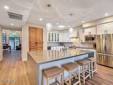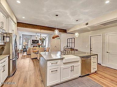 This is a beautiful exquisitely remodeled 2 bedroom + Den, 2 bathroom single level patio home in the exclusive gated Scottsdale community of La Villita. Just minutes from Old Town, this home was completely remodeled from top to bottom in 2018/2019. The home features open floor plan, wood floors throughout, upgraded fixtures and ceiling fans in each room. Amazing kitchen features upgraded cabinets, large island with quartz countertops and farm house sink, stainless steel appliances, wine refrigerator & all the necessities. Large master suite with patio access, large walk-in closet, double sinks and beautiful extra large glass enclosed shower. Private patio with travertine tile and fruit trees. The immaculate 2 car garage has attached cabinets & workbench.