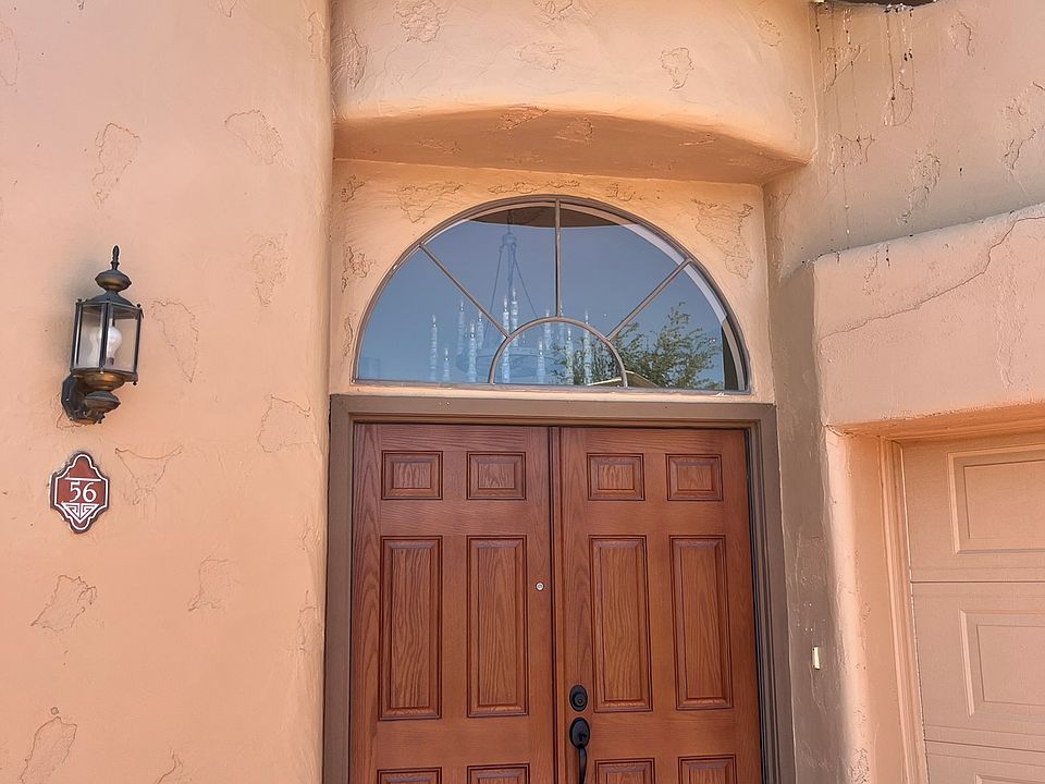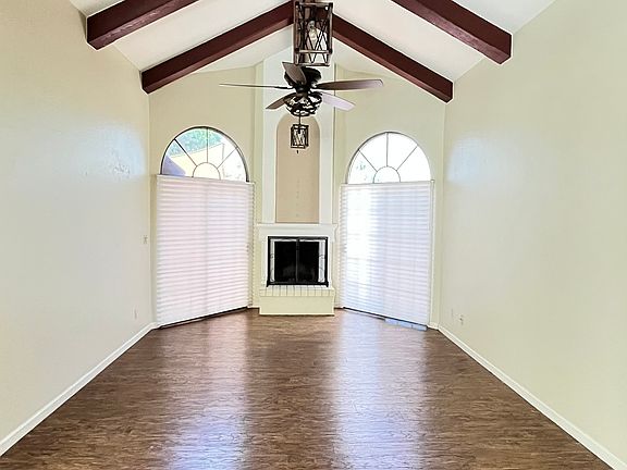Enter this gorgeous double door vaulted custom entry. An immediate left into primary bedroom with Shaker Shutters, wood like flooring & ceiling fan. Continue to primary bathroom with dual closets w/organizers, dual vanity, charming chandeliers, separate shower and soaking tub to melt away a stressful day. Head down hallway to atrium, and vaulted living room with exposed beams and wood burning fireplace. Nearby wet bar with storage maximizing space. Guest bath with tub/shower combo. Guest bedroom with wood like flooring & ceiling fan. Formal dining room and eat-in kitchen with lots of cabinets, pantry and natural light. Private covered patio, 2 car garage. Includes fridge and full size front load washer & dryer. gated & community pool One year minimum lease