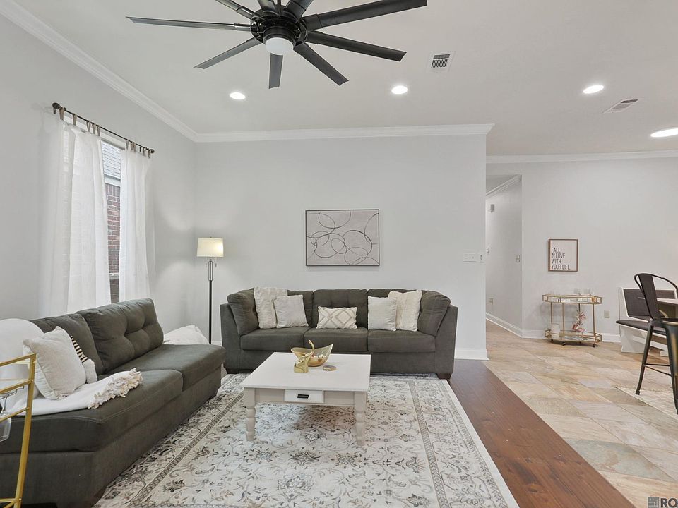 Discover this super cute home near LSU! This inviting 3-bedroom, 2-bathroom residence features a dedicated office space, perfect for remote work or study. Enjoy the open-concept design that connects the living area and kitchen, making it ideal for gatherings. Freshly painted and updated with new stucco, it has beautiful wood flooring in the main living area and an oversized ceiling fan for added comfort. The luxurious main bedroom offers French doors leading to an ensuite bathroom complete with a relaxing garden tub, separate shower, dual vanities, and a spacious walk-in closet that conveniently connects to the laundry room. Step outside to a fully fenced backyard and an enclosed garage, plus enjoy the amenities of a gated community with walking trails, a pool, and a clubhouse! This is an excellent opportunity to live near LSU in such a desirable location, so make your appointment today!!