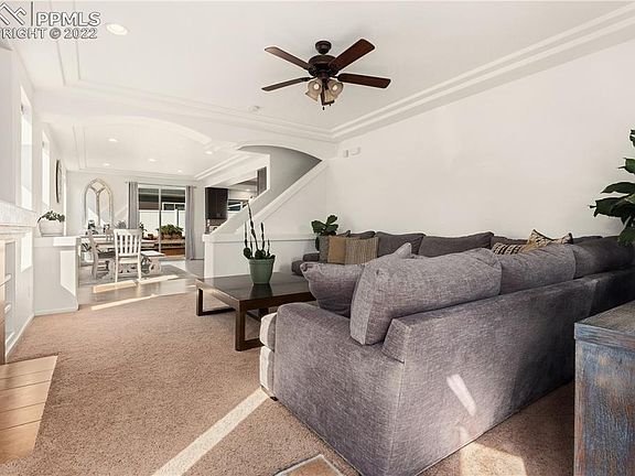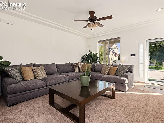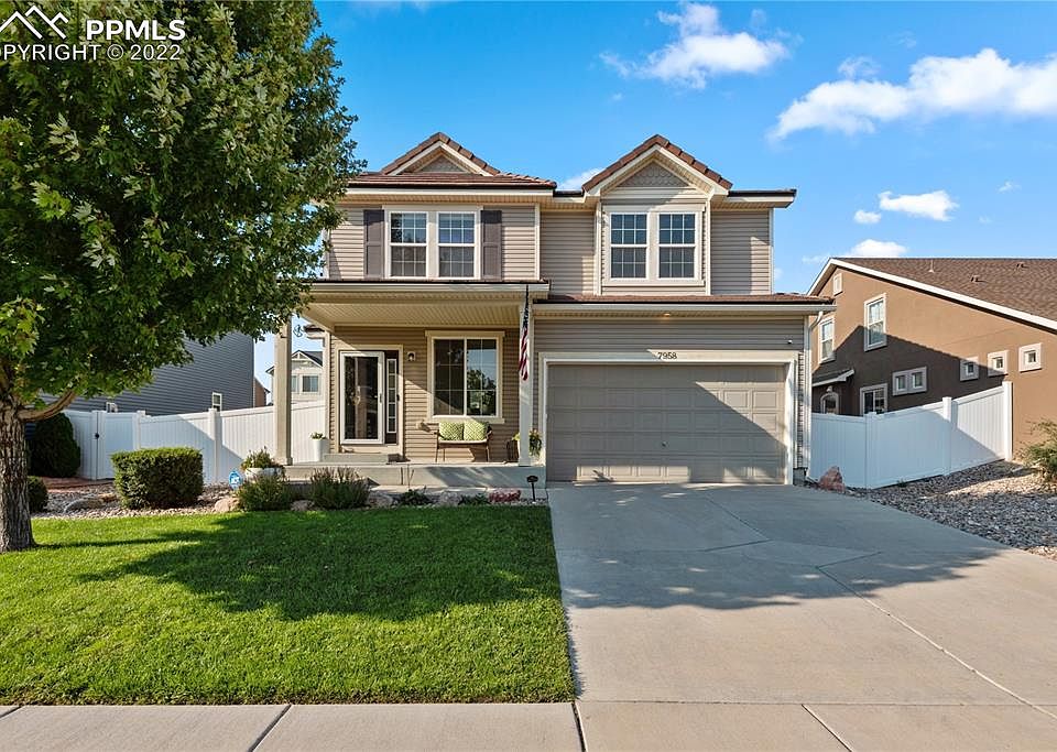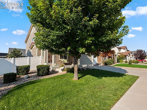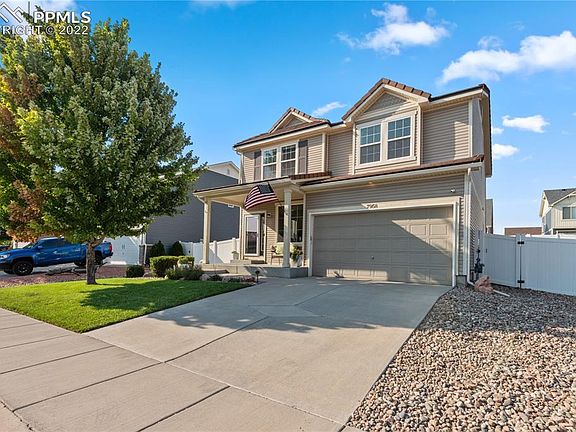 Gorgeous 3-bed, 3-bath, 2-story home with mountain views, Central AC, and an attached 2-car garage. Fantastic curb appeal with a large covered front porch and tile roof. Coved ceilings and soft arches on the main level. Spend cozy Colorado nights by the fireplace in the Living Room. The spacious Dining Area walks out to the backyard. The Kitchen has granite counters, a large Island with a Breakfast Bar, tons of cabinets, and a pantry. The spacious Master Suite has a coved ceiling, walk-in closet, and an adjoining 5-piece Master bath with double vanity, generous soaking tub, and separate Master Shower. The enormous loft is perfect for a Family Room, Office, or Playroom. Two additional Bedrooms and a full guest bath complete the upper level. There is a convenient Powder Room and a Laundry Room on the main level. The full, unfinished basement is ready for your customization. The large backyard with a privacy fence, grilling area, and garden boxes, is perfect for outdoor entertaining and fun. Plenty of room for your furry friends to roam! Additional home amenities include a sump pump, Guardian air filtration system, and humidifier. The community offers disc golf, parks, playgrounds, open spaces, and trails. Convenient to FortCarson and Peterson Air Force Base. Don't miss out on this beautiful home!